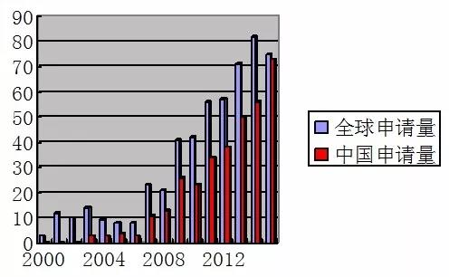 下图显示了全球范围内的与脑电控制相关的专利申请量和中国国内申请量。